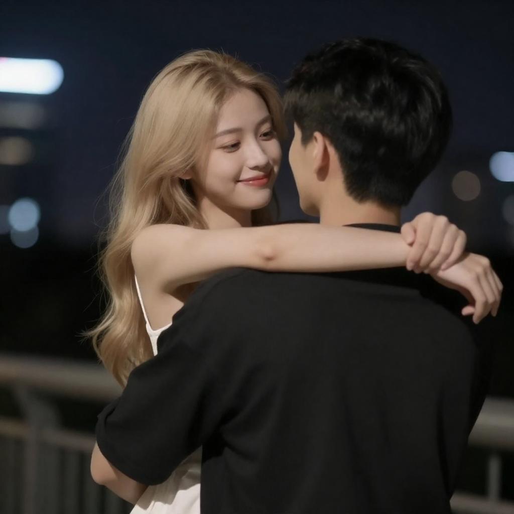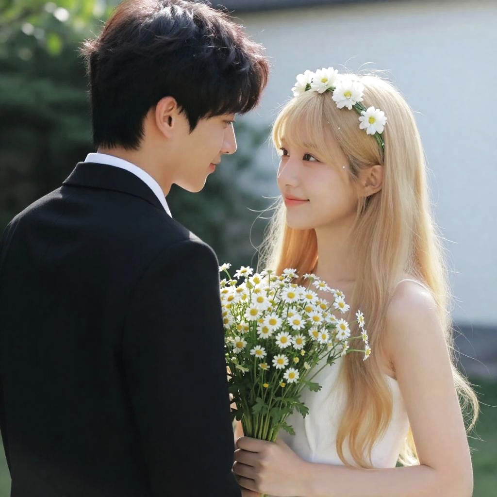 Photograph of a couple in a close embrace. The man with short dark hair in a black suit looks at the woman. The woman with long blonde hair wears a white floral headband and a white dress, holding a bouquet of daisies. Background includes greenery and a light blue wall. Both have gentle, smiling expressions.