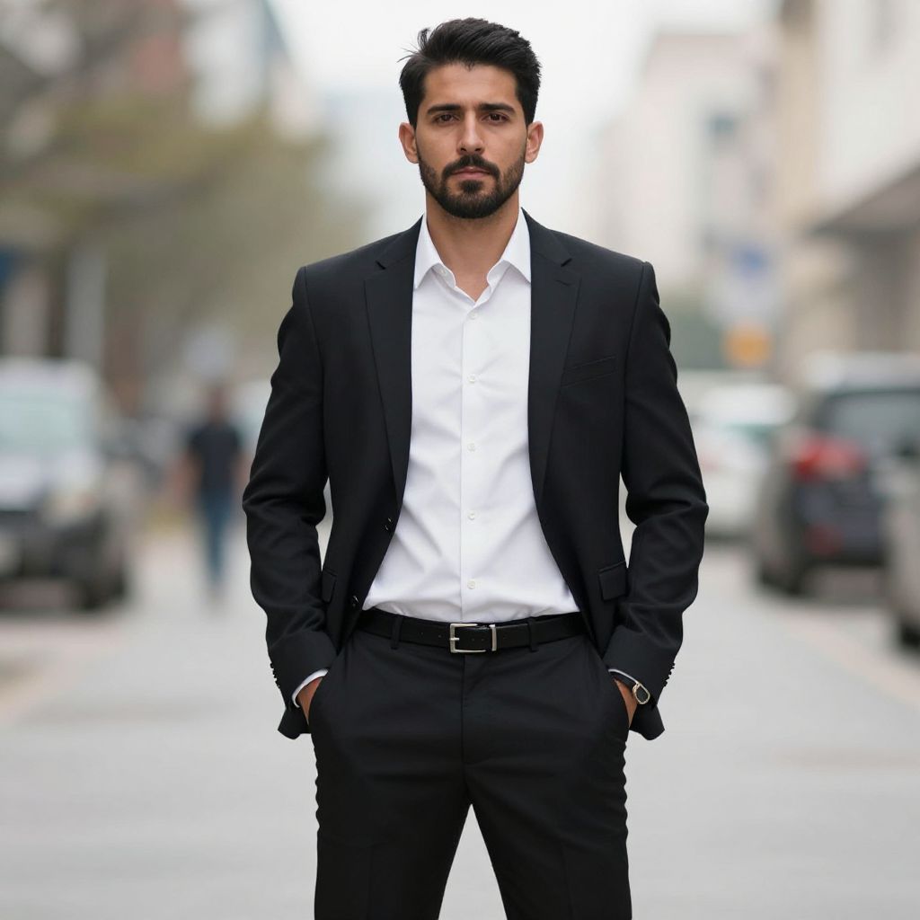 Photograph of a handsome, bearded man with dark hair, wearing a black suit, white shirt, and black pants, standing confidently on a blurred