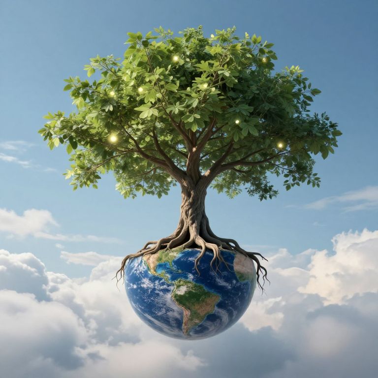 Photograph-style digital illustration of a large, vibrant tree with lush green leaves and intricate root system, floating in the sky above a partially visible Earth. The tree's roots emerge from the planet's surface, blending with the blue and green continents. The sky is bright and clear, with fluffy white clouds scattered across the background. Small, glowing yellow lights are scattered throughout the tree's foliage, adding a magical, ethereal quality. The image combines realistic and fantastical elements, emphasizing themes of nature and the interconnectedness of the Earth and its ecosystem.