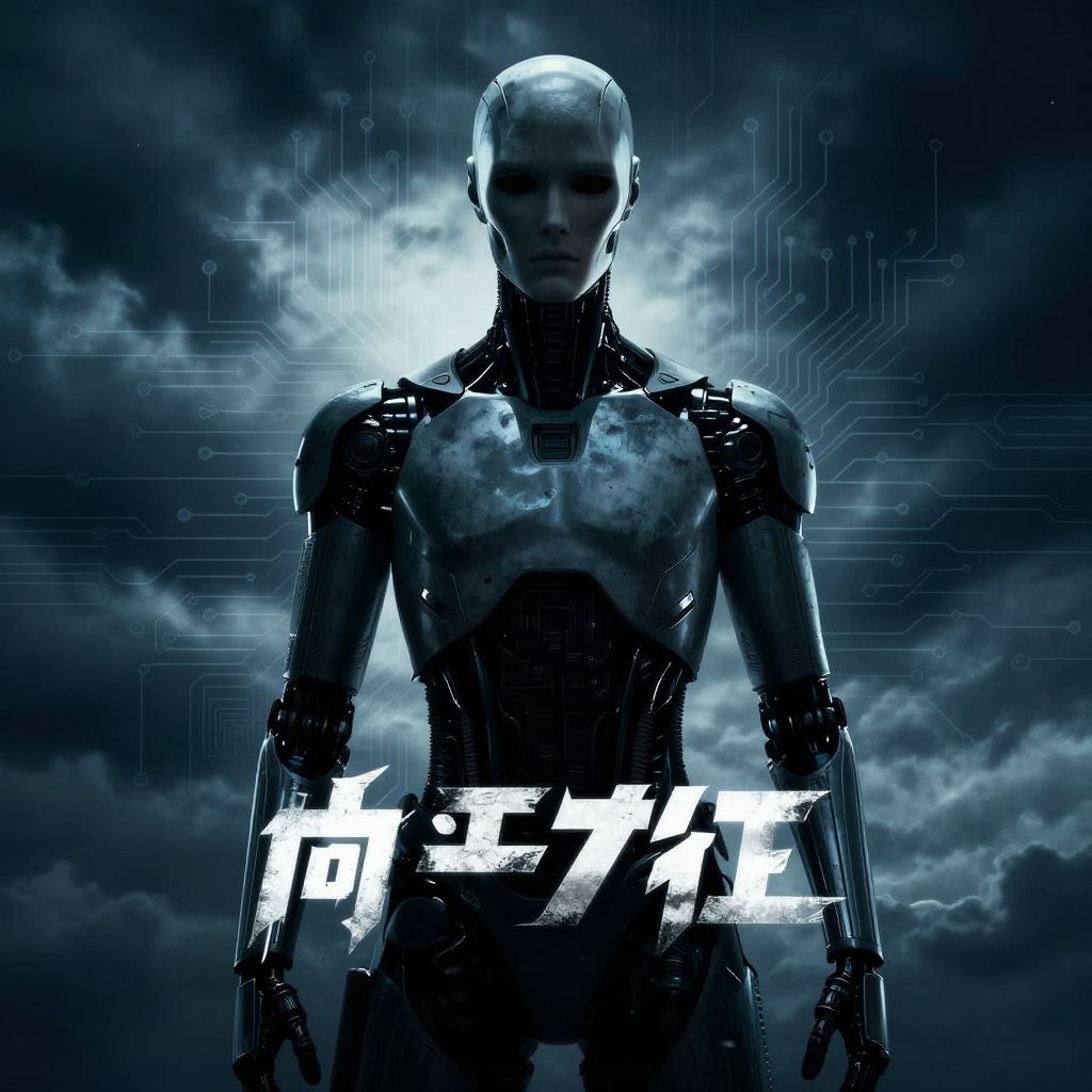 Movie poster AI style visualization featuring a heroic AI entity standing atop a crumbling city ruin, epic sunrise behind with golden and orange hues, futuristic armor with intricate circuitry glowing, dynamic perspective, atmospheric particles and sleek futuristic typography.