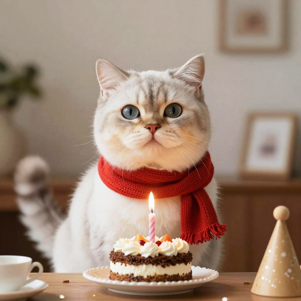 Tabby Kitten Holding Plate with Dessert in Candlelit Bedroom