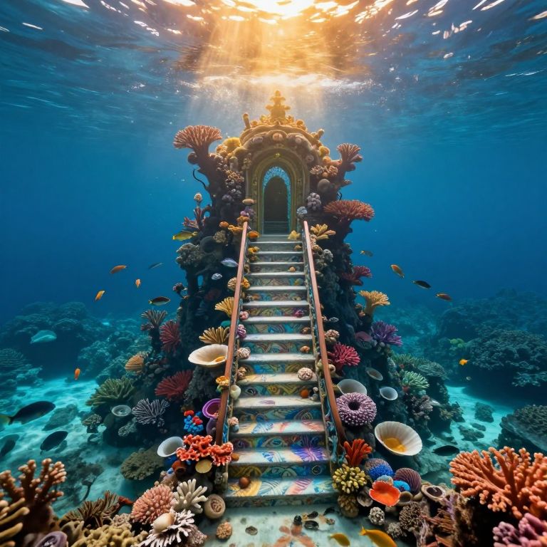 Envision an enchanting underwater scene, reminiscent of surrealist dreamscapes but rendered in hyperrealistic detail akin to contemporary photorealists. At the heart of this captivating tableau lies an opulent staircase rising from the ocean floor, its steps adorned with intricate patterns that mirror the vibrant hues and textures of coral and shells. From a bird's-eye view, witness this otherworldly descent into the depths as sunlight filters through layers of crystalline water above, bathing the fantastical architecture below in golden beams while leaving shadows to dance across the undulating marine environment. This mesmerizing tableau comes alive with abundant aquatic life, schools of fish gracefully swimming around and between the steps, creating a harmonious ballet of color and movement that blurs the line between dreamscape and reality.