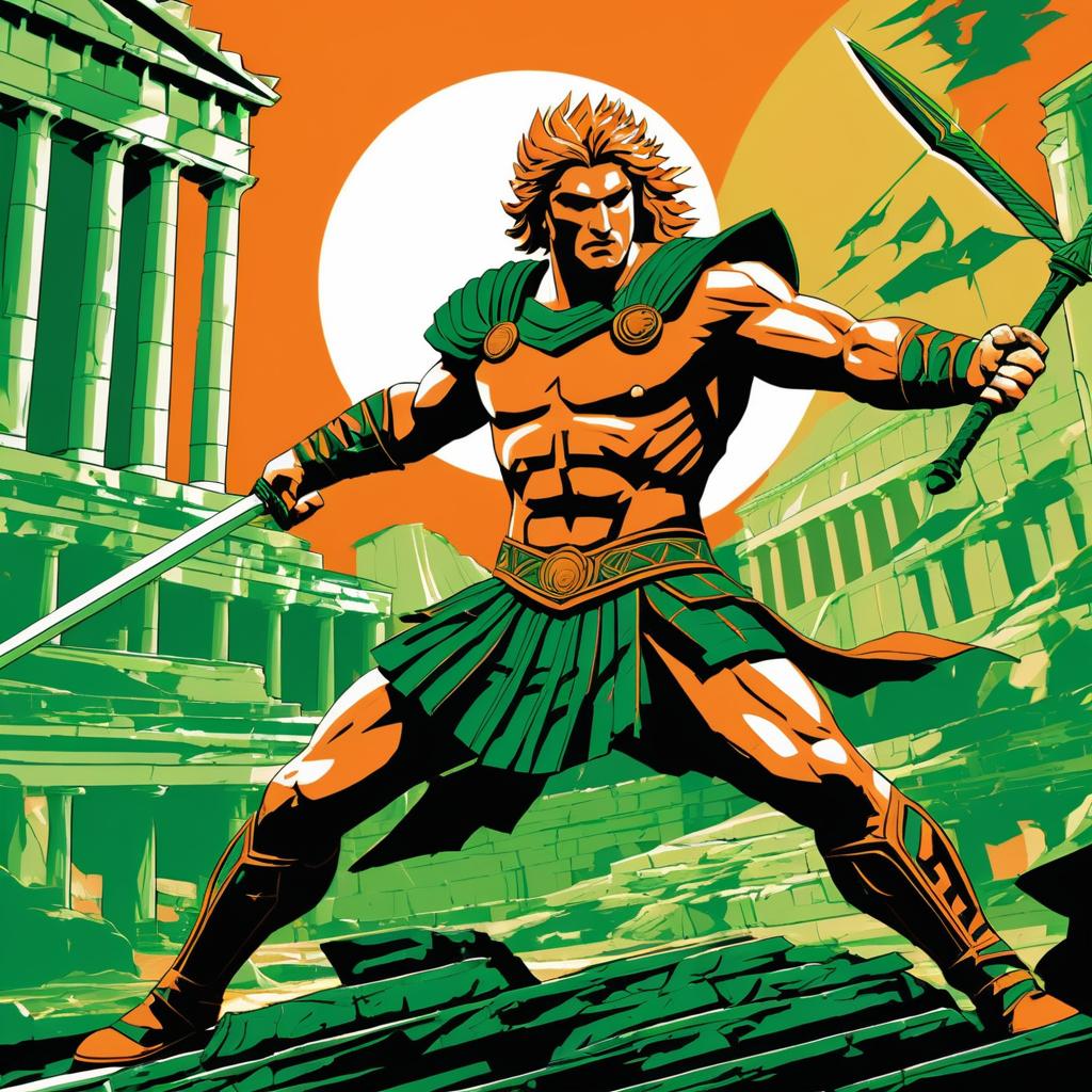 Illustration of Achilles from the Trojan War depicted in a comic book style, shown fighting on ancient temple ruins with a spear and a secondary weapon. The character displays a fierce expression of anger and determination. The color scheme features dark shades of green and orange, with sharp, direct lighting emphasizing the muscular form of the warrior. The setting includes classical Greek architectural elements such as columns and stone steps against a dramatic sunset background.
