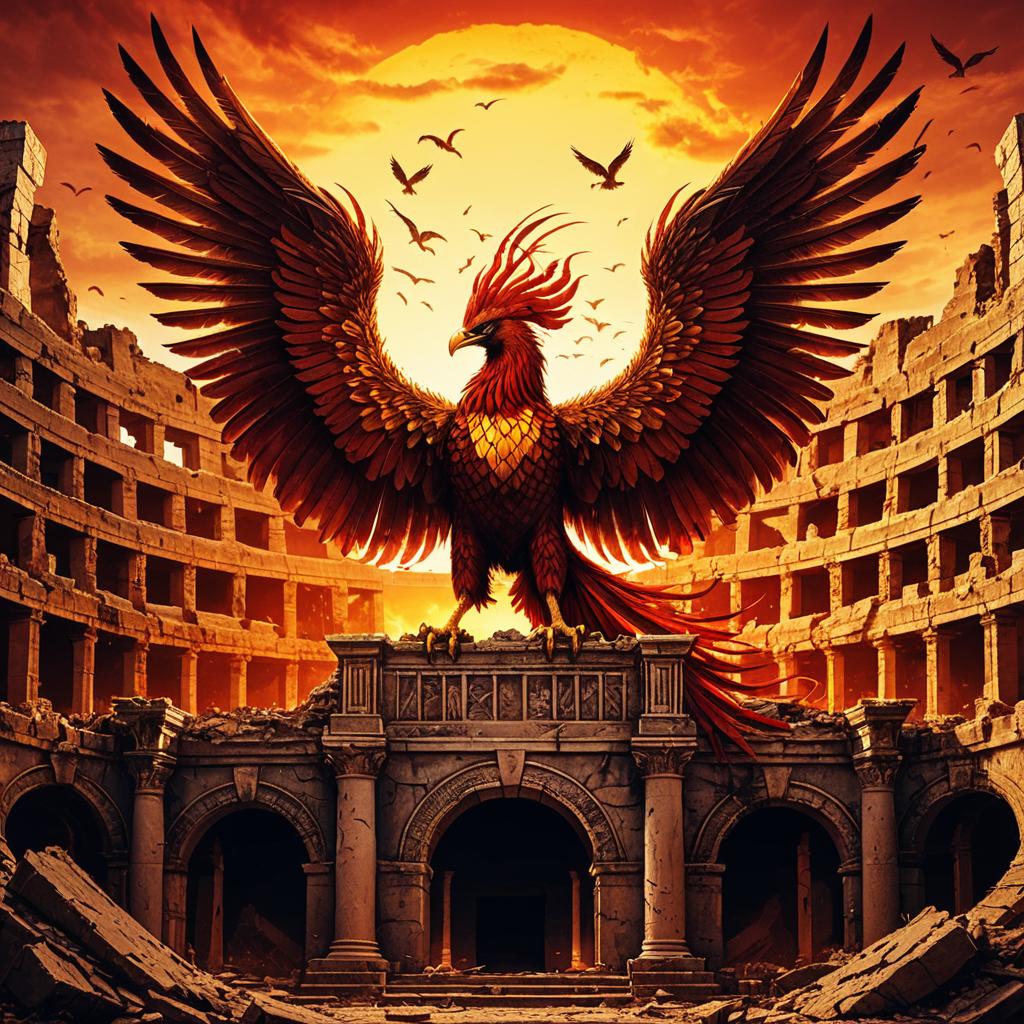 High-detailed illustration of a phoenix wrapped around a ruined amphitheater, wings curled protectively, fiery red feathers, golden sunset background, epic fantasy theme.