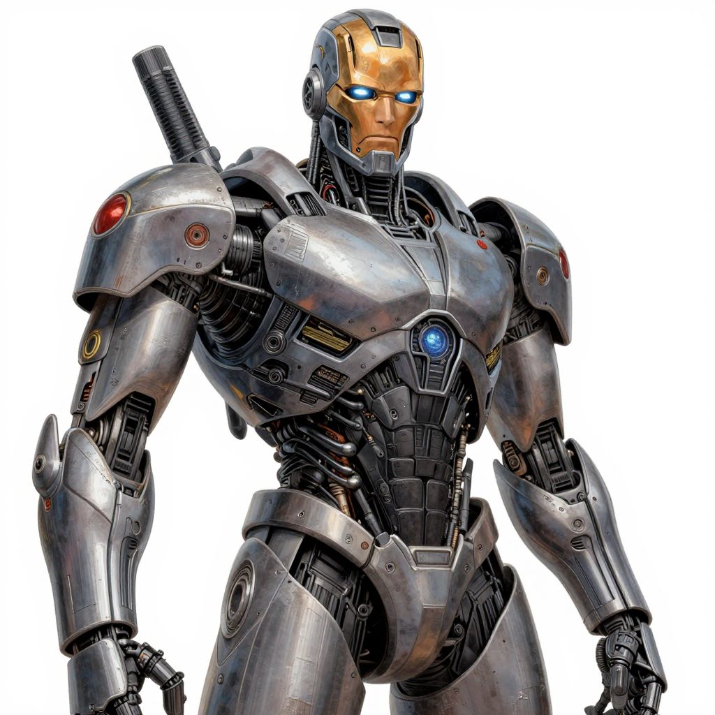 Digital illustration of a muscular, silver-toned Iron Man robot with red and blue glowing eyes, and shoulder cannon, standing against a white background.
