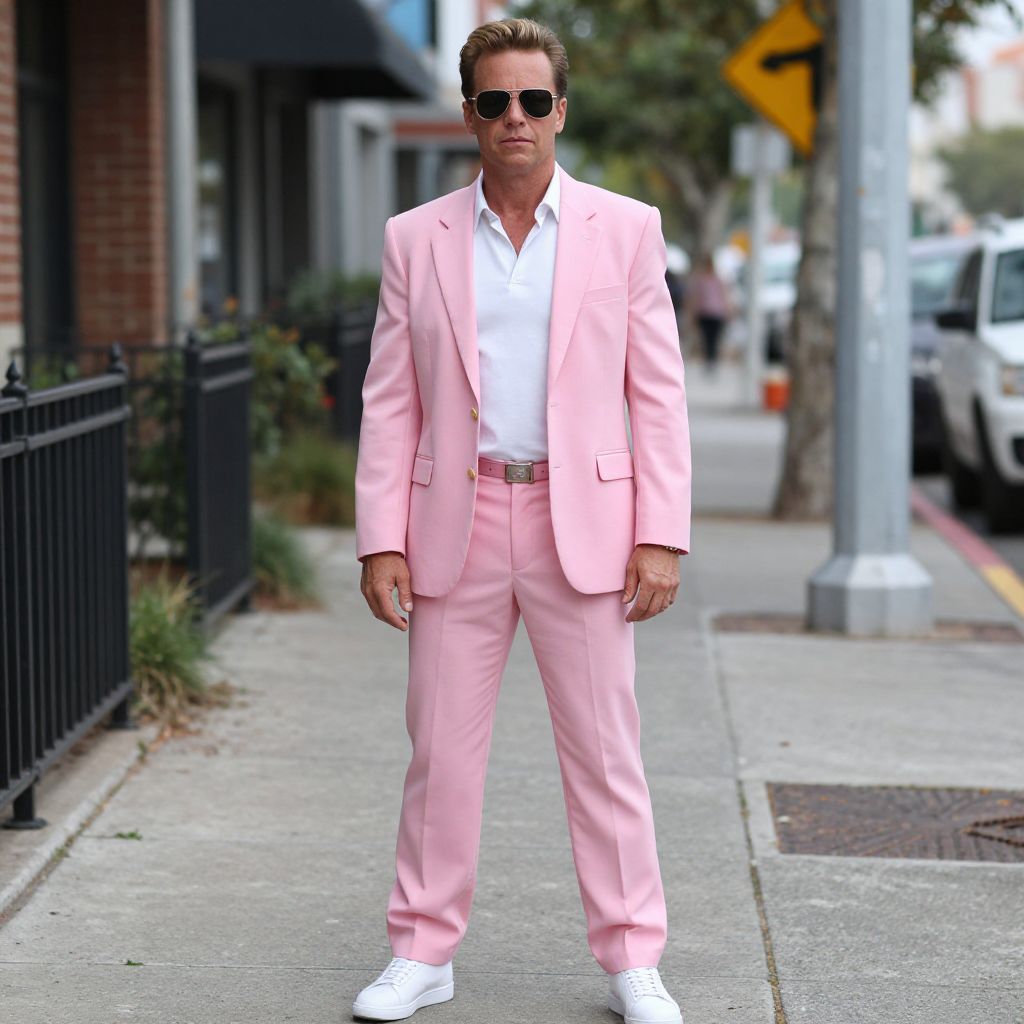 Miami Vice 80s Costume, a man in a pink suit and sunglasses standing on a sidewalk