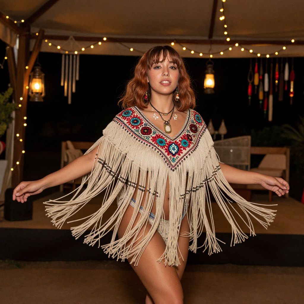 Photograph of a woman with light brown, wavy hair and bangs, wearing a fringe shawl adorned with colorful embroidery in red, blue, and green patterns, and a black bikini underneath. She has a medium build and is posing with her arms outstretched. She wears long, dangling earrings and a necklace with a large pendant. The background features a dimly lit outdoor setting with string lights, a wooden canopy, and blurred furniture, creating a bohemian atmosphere. The image has a warm, golden glow, emphasizing the festive and stylish ambiance.