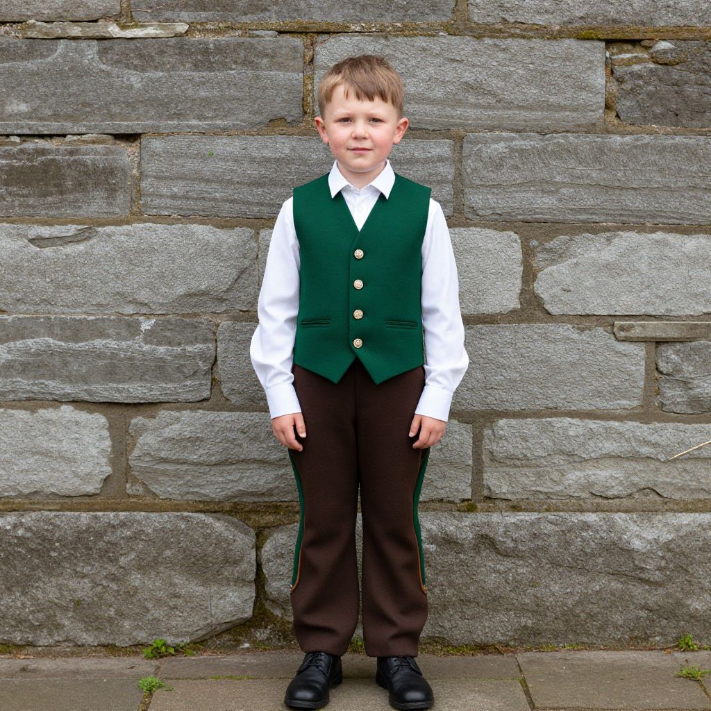 Irish Costume For Boy, boy in green vest and brown pants standing in front of a stone wall
