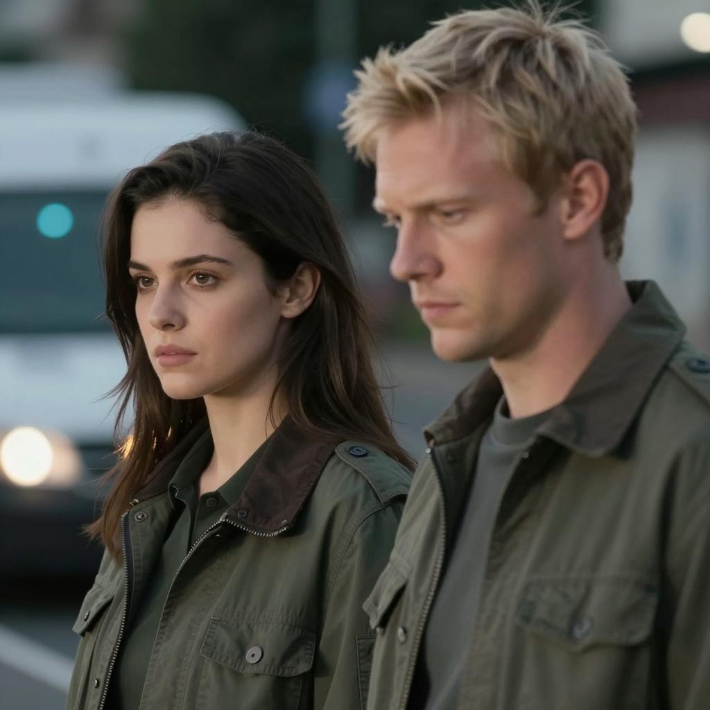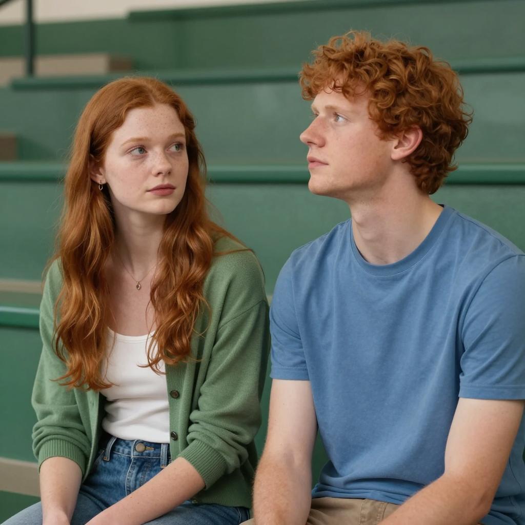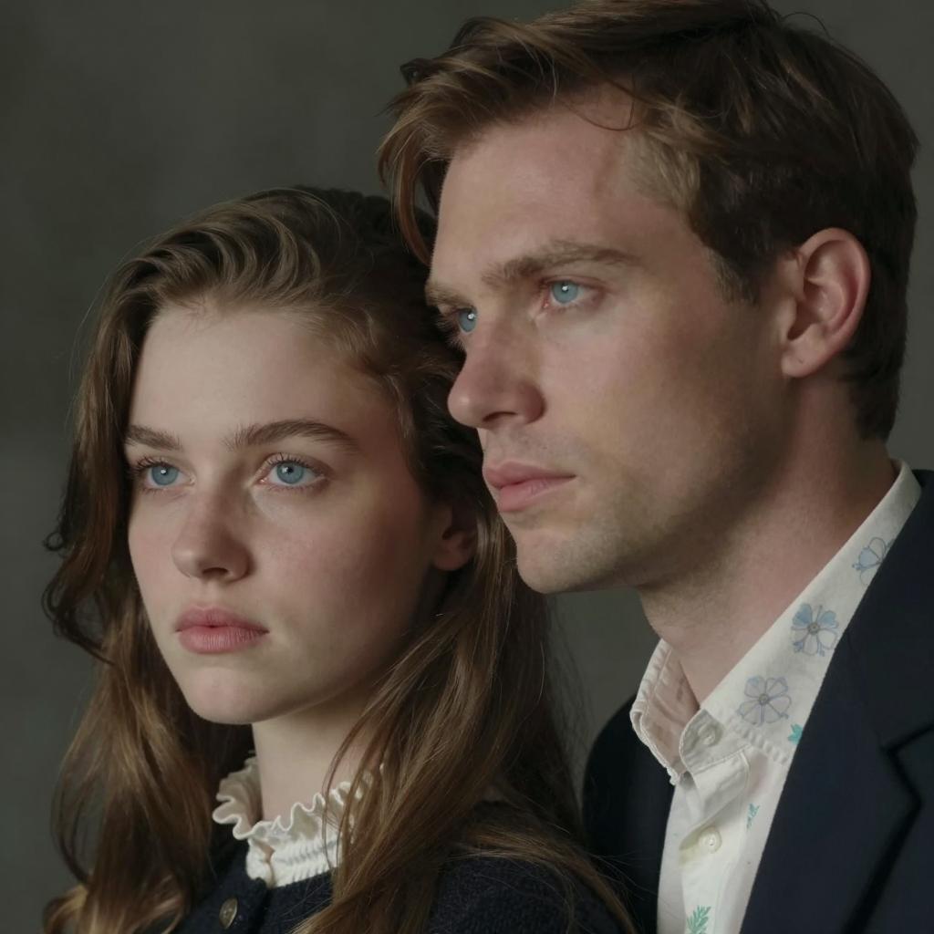 Two people against a rocky wall. Blonde woman with light skin and bangs, wearing a pinkish-brown top, looks upward. Blonde man with light skin, wearing a plaid shirt and vest, rests his chin on his hand. Both have soft expressions. Woman on left, man on right. Rocky ure in background. Man's wristband is red.