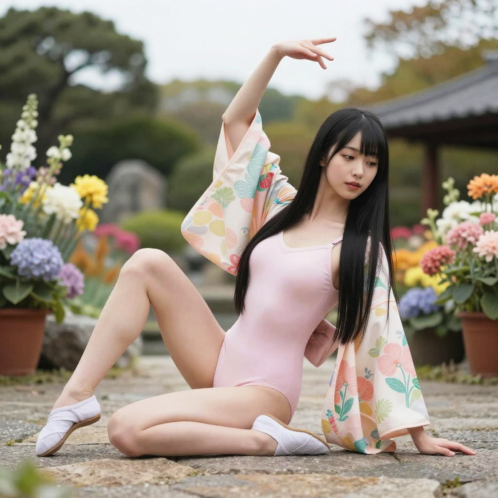 Realistic photo.4K glamour photography of a graceful 25-year-old Japanese contortionist, sitting in a serene garden, in an intricate pose. She has long straight black hair, and wears a fitted leotard and flowing kimono. The composition features colorful flowers, soft pastel colors, captured in a low-angle portrait shot emphasizing realism and vibrant details with professional lighting. realistic photo