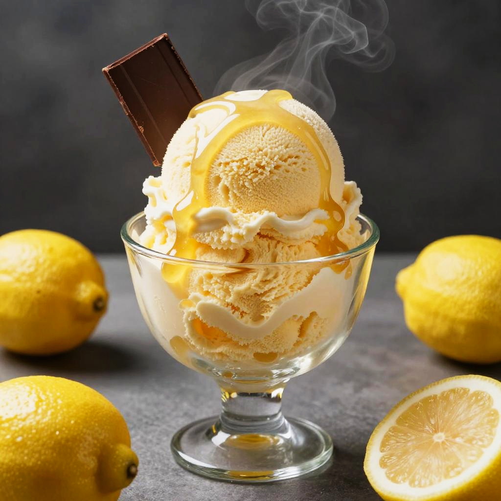 A highly stylized, realistic 4K render of lemon ice cream served in a glass dish, topped with golden maple syrup and a piece of dark chocolate. Steam or smoke rises from the ice cream, enhancing the dramatic and cinematic lighting with a shallow depth of field. Several whole and sliced lemons surround the dish, adding a fresh, vibrant contrast.