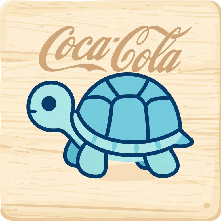 Digital cartoon of a blue, simple turtle with a segmented shell and black outline, on a beige textured background with "Coca-Cola" cursive text