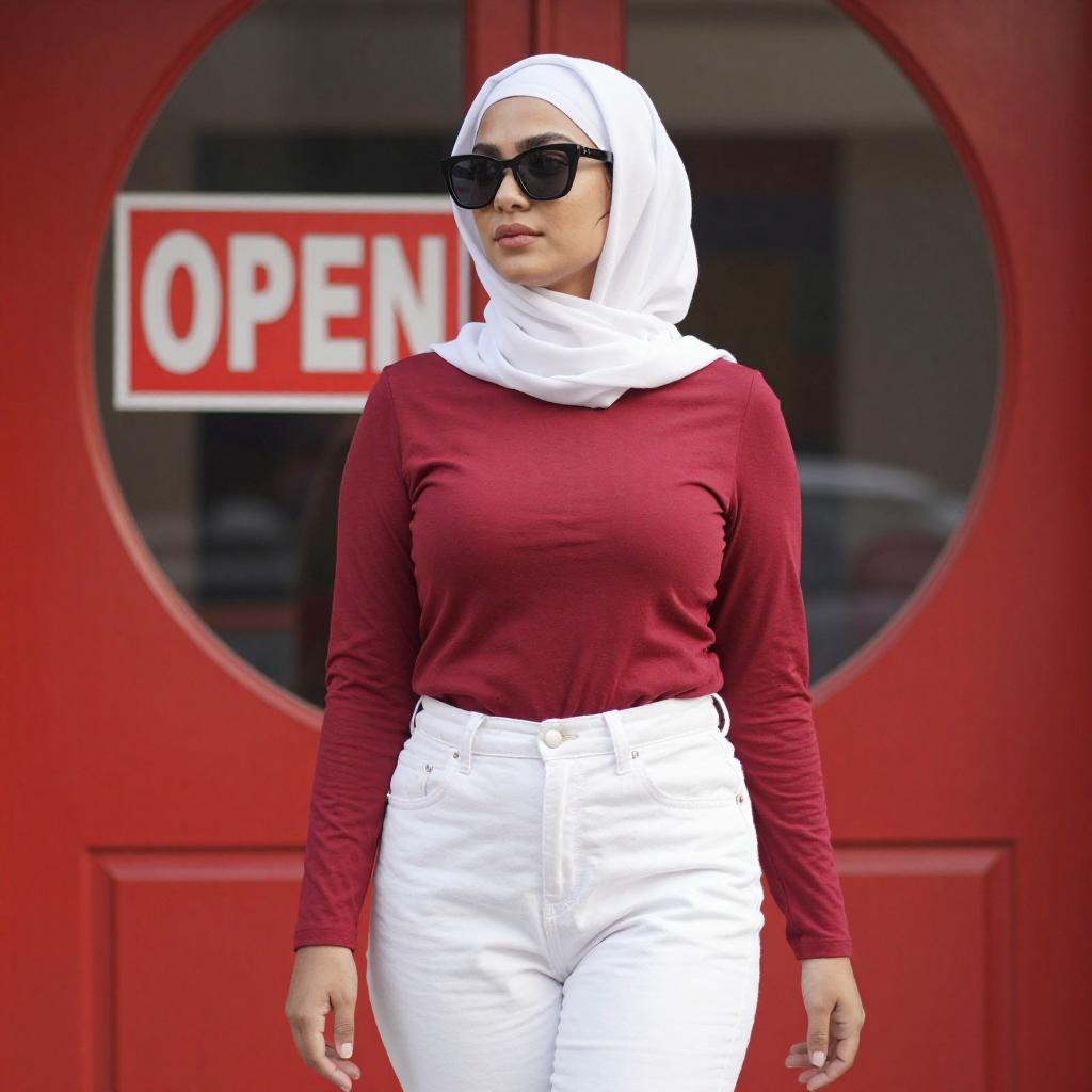 Photograph of a woman with light skin, wearing a white hijab, black sunglasses, red long-sleeve top, and white pants, standing in front of a bright red circular door. She has a curvy figure and is looking to the side with a confident expression. The background includes a red "OPEN" sign partially visible through the door.