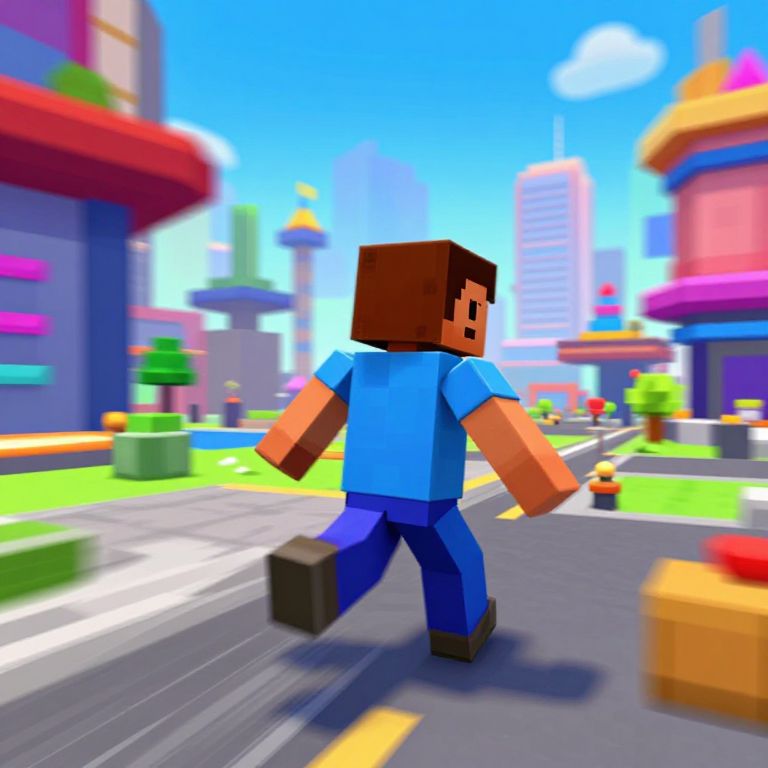 Roblox noob running through an obstacle course filled with colorful platforms and spinning traps, bright and vivid Roblox aesthetic, energetic motion blur, fun and fast-paced vibe