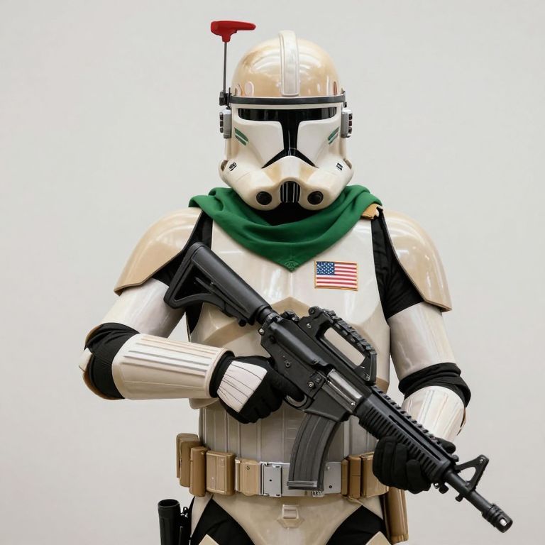 Commander Cody, Clone Marshal of the 7th Sky Corps and leader of the 212th Attack Battalion, stands resolute in his tan armor, gripping a black assault rifle with precision, his green scarf draped around his neck and American flag insignia proudly displayed on his chest.