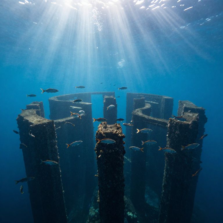 Amidst the ethereal glow of sunlit waters, schools of fish navigate an otherworldly labyrinth of towering pillars, their graceful movements a testament to the delicate dance between freedom and structure, evoking a serene yet enigmatic sense of belonging within an infinite aquatic cosmos.