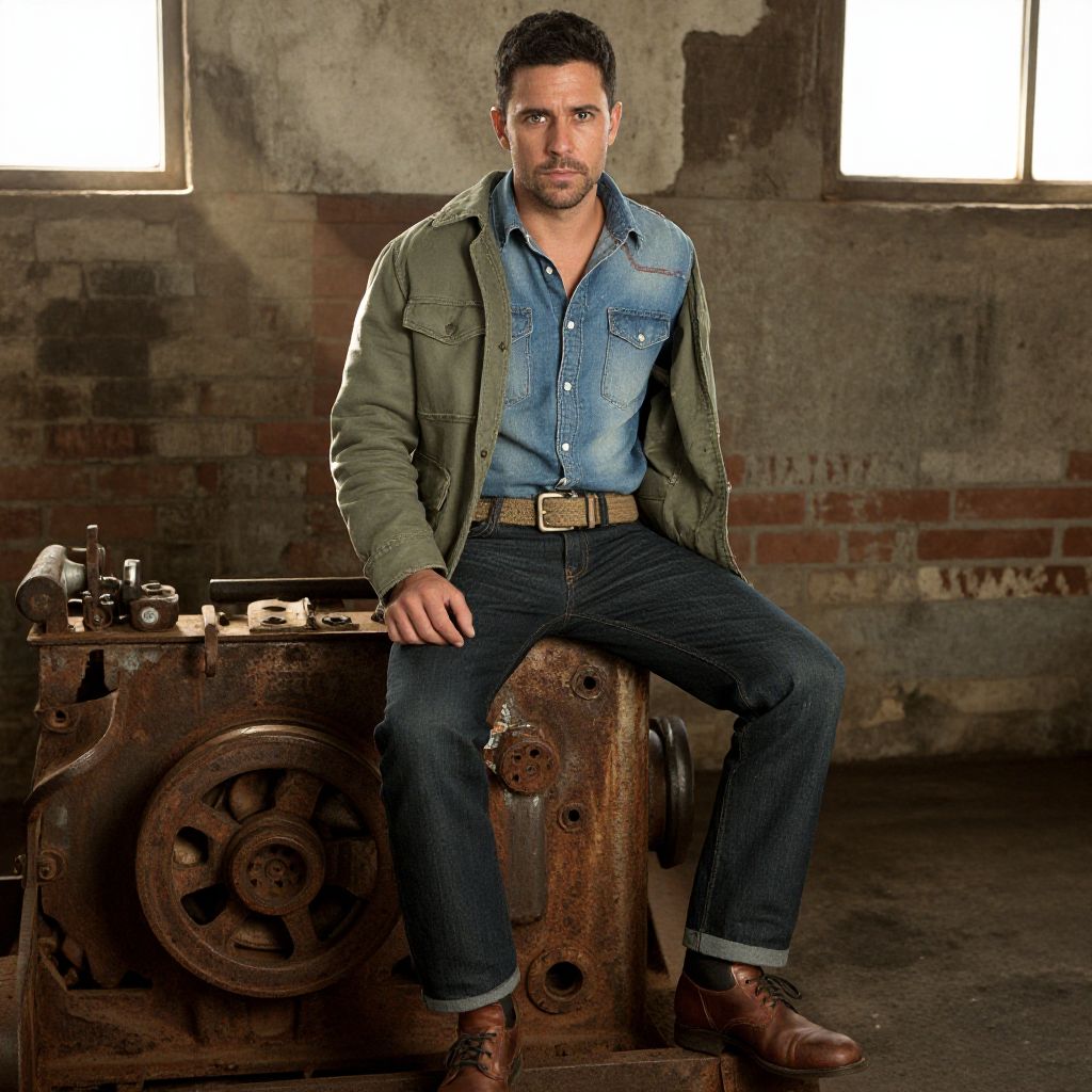 A man, rugged chambray shirt, dark indigo jeans, brown leather boots, olive green canvas jacket, textured cotton belt, rusting machinery, faded brick walls, shafts of light filtering through dusty windows, pinhole camera style, contemplative expressionMan has masculine face and piercing eyes