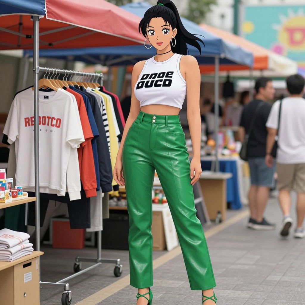 A tall woman in street style, wearing a white crop top with bold black lettering and high-waisted green faux leather pants, poses confidently at a vibrant street market clothing rack. She complements her look with green strappy heels and delicate silver hoop earrings, her sleek ponytail swaying gently. The scene is infused with the colorful, dynamic visual style of toei animation. Sexy. Pretty face and beutiful eyes Sexy. Pretty face and beаutiful eyes. Big breasts