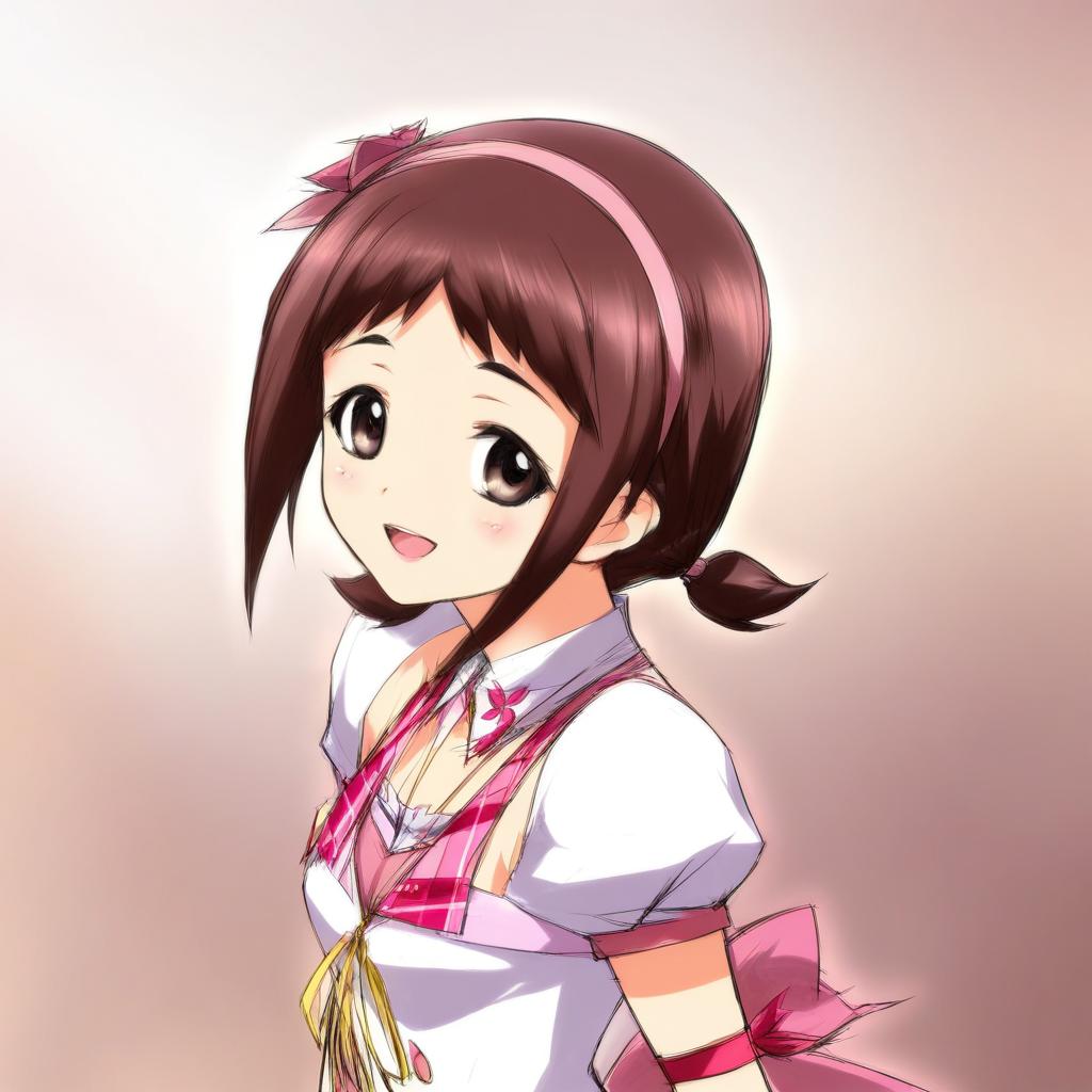 This is a digital anime-style drawing of a young girl with large, expressive brown eyes and short, dark brown hair adorned with a pink flower hairpin and a pink headband. She has a cheerful smile and is wearing a white blouse with puffed sleeves, a pink and red plaid ribbon, and a yellow necktie. Her outfit includes pink gloves and a pink bow on her right arm. The background is a gradient of soft pink and white, adding to the bright and cheerful atmosphere of the image. Her hair is tied into small pigtails.