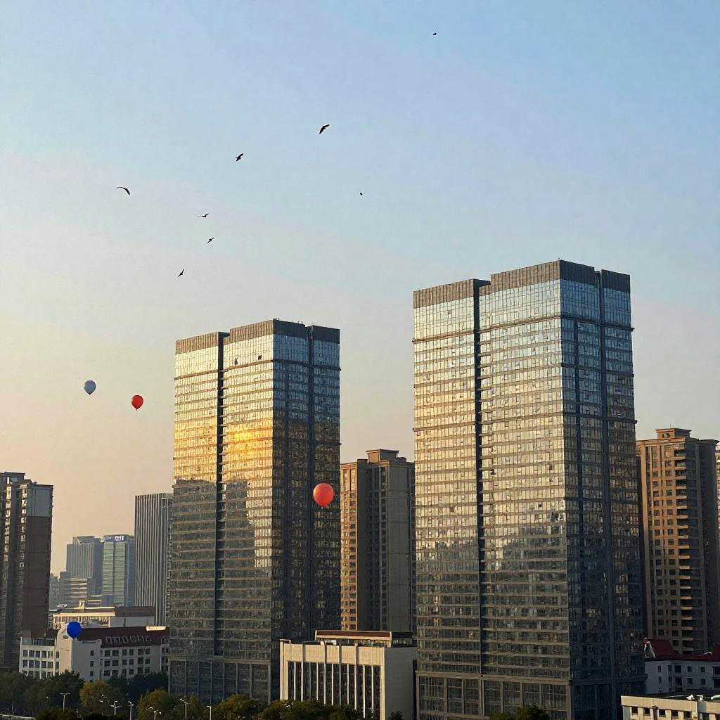 Airyness captured in a cityscape with tall glass buildings reflecting the sky, birds soaring high, and airy balloons drifting gently, all enveloped in soft early morning light with peaceful tones and a sense of expansive openness.