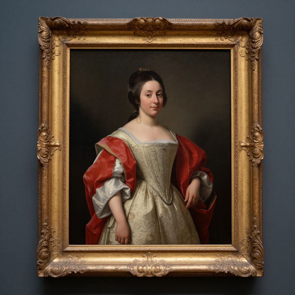 Photograph of an 18th-century oil painting of a woman in a gold patterned dress with a red velvet cloak, framed in an ornate
