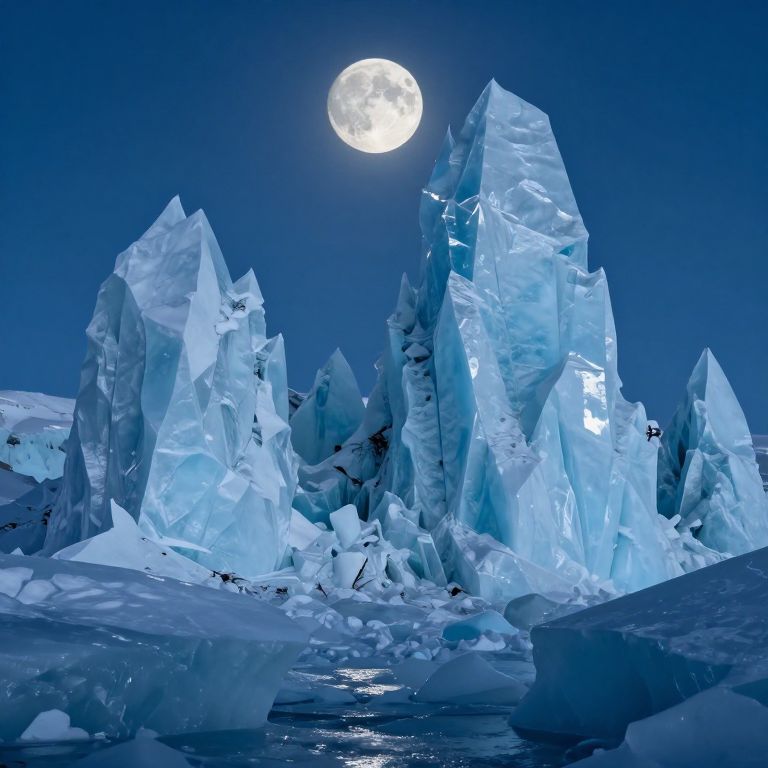 Under the watchful gaze of the moon, colossal ice formations rise from the depths like crystalline monuments to forgotten worlds, their jagged edges whispering tales of isolation and the relentless march of time.