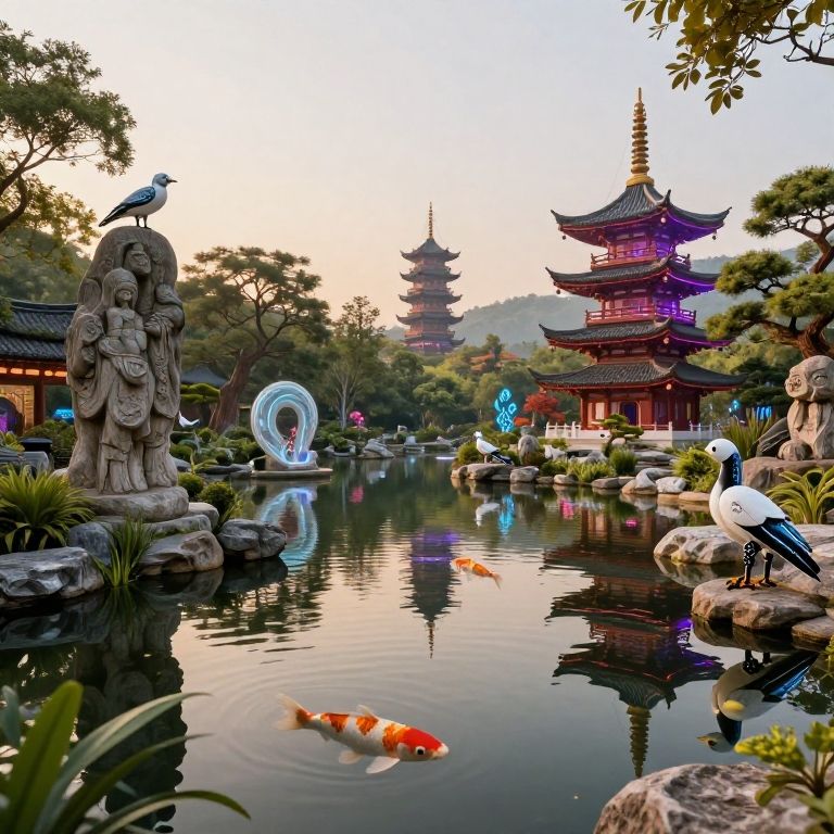 Photograph of a serene Japanese garden at sunset, featuring a tranquil pond with a colorful koi fish and a white bird perched on a rock. In the background, a traditional Chinese pagoda with a golden spire stands illuminated in purple light. On the left, a stone statue of a robed figure holds a bird. The pond reflects the surrounding greenery and twilight sky. Additional birds and illuminated blue and pink lights enhance the tranquil, mystical ambiance.