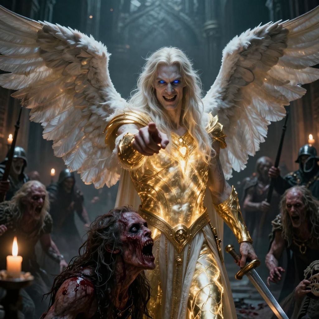 A photo of a (menacing celestial arcangel (((Gandalf))) lord:1.3), (have big white wings :1.2), piercing luminous blue eyes, (grinning beautiful face:1.0), muscular build, (pointing directly at viewer:1.2), (heavenly light on the contour of his pale body ) surrounded by an army of (ghouls and angels mens figures:1.1), flickering candlelight, exterior battle camp setting, (celestial soldier with rifle:1.1), atmospheric dread, gothic horror theme, Sony A7R IV, 1/60s, f/2.8, ISO 1000, cinematic composition, HDR imaging, detailed textures, macabre mood, RAW photography, professional grade, photography in the style of Labirynth movie, close up of (awful) and (sweet) creature with sword stained with (blood), in a gigant ancient and ruined labirynth, fantasy, hyper detailed, real beautiful skin imperfections, hard lighting, bokeh, ((curi:1.2))golden luminous armor celestial