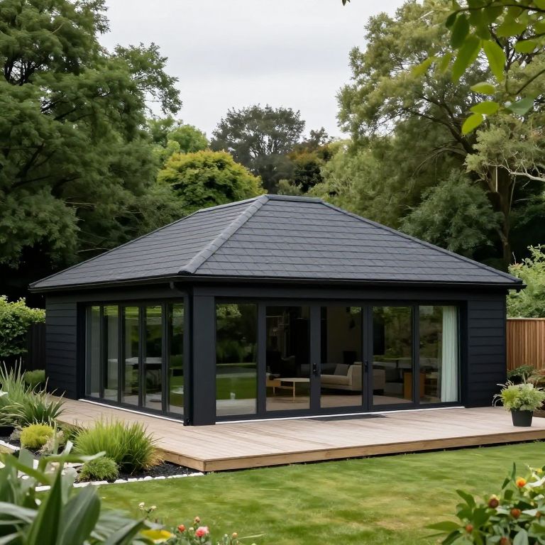 Modern garden extension with a sleek black tiled roof and large glass doors sits gracefully on a wooden deck, surrounded by lush greenery and framed by a backdrop of mature trees in Uplands, Somerset.