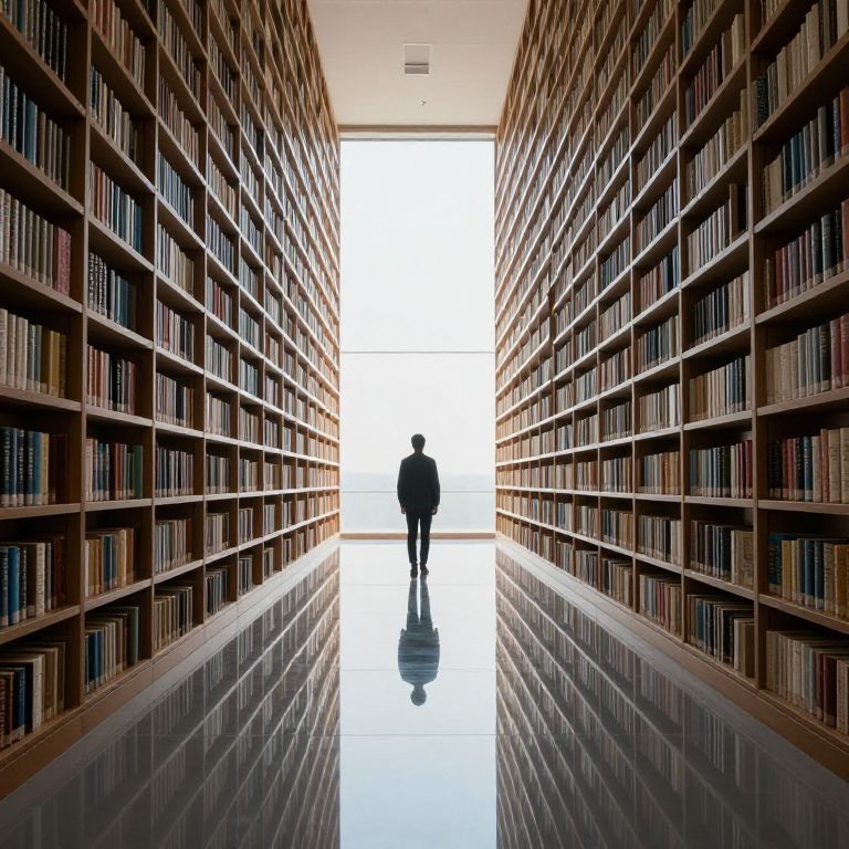 A solitary figure stands at the center of an endless library corridor, where towering shelves stretch infinitely into a luminous horizon, reflecting a surreal mirror-world beneath their feet, blurring the line between reality and its infinite reflections.