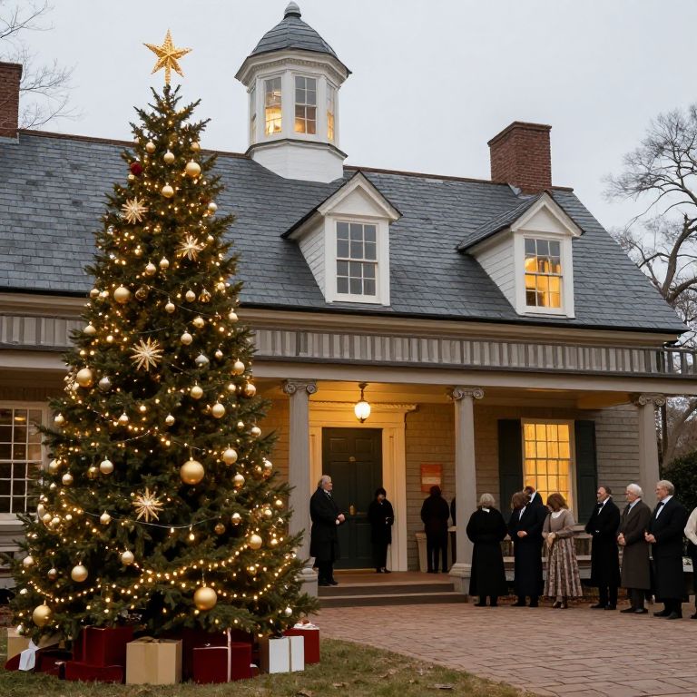 Photograph of a lit Christmas tree in front of a colonial-style house, with people in winter clothes gathered on the porch.