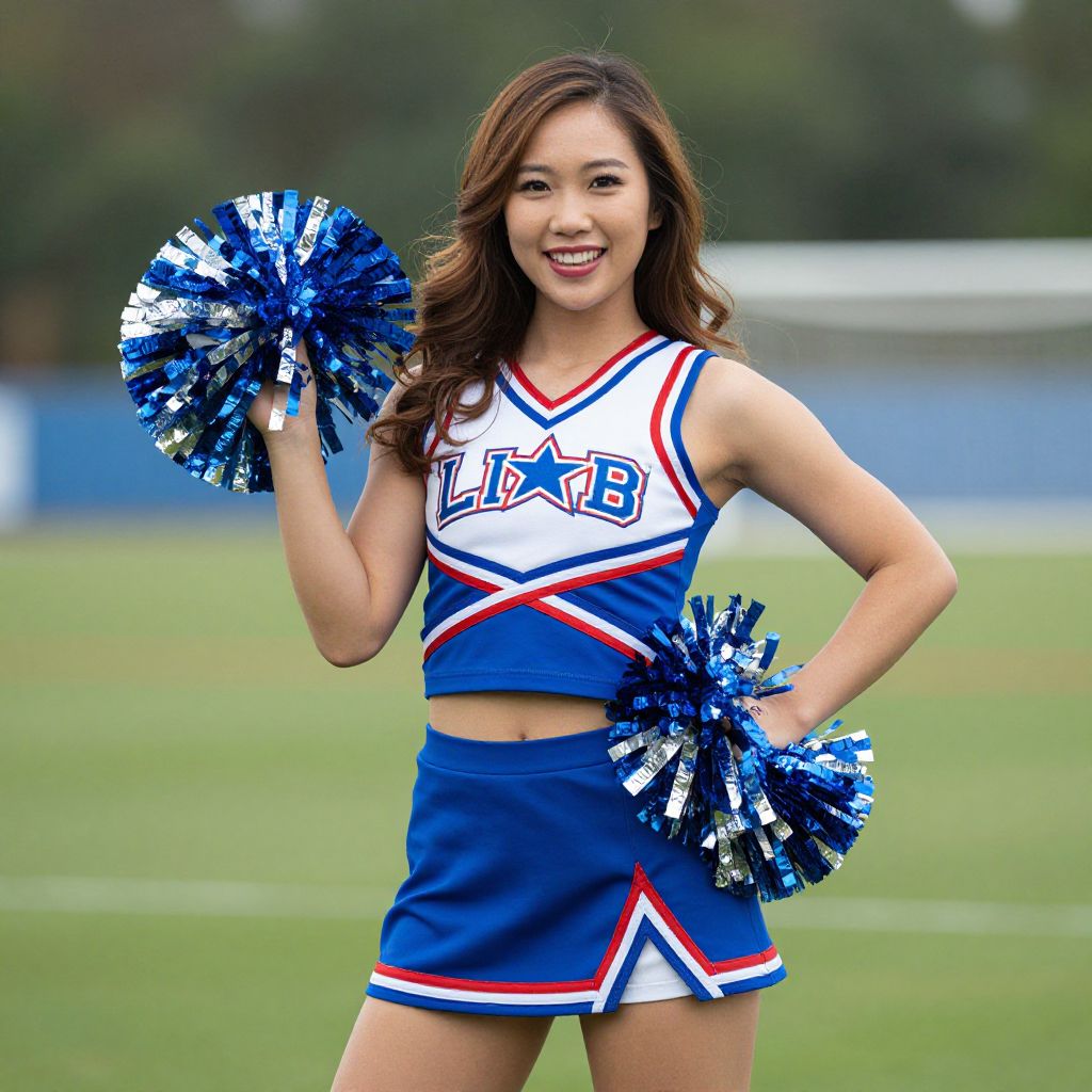 Photograph of an Asian cheerleader with long brown hair, wearing a blue and white "LAKE" cheerleading outfit, holding blue and silver pom