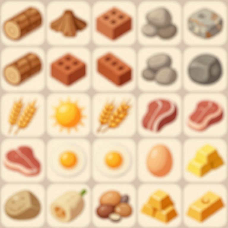 Blur a set of square tiles each featuring a soft cartoonish depiection of a different resource, including logs, bricks, stones, wheat, meat, eggs, gold bars,