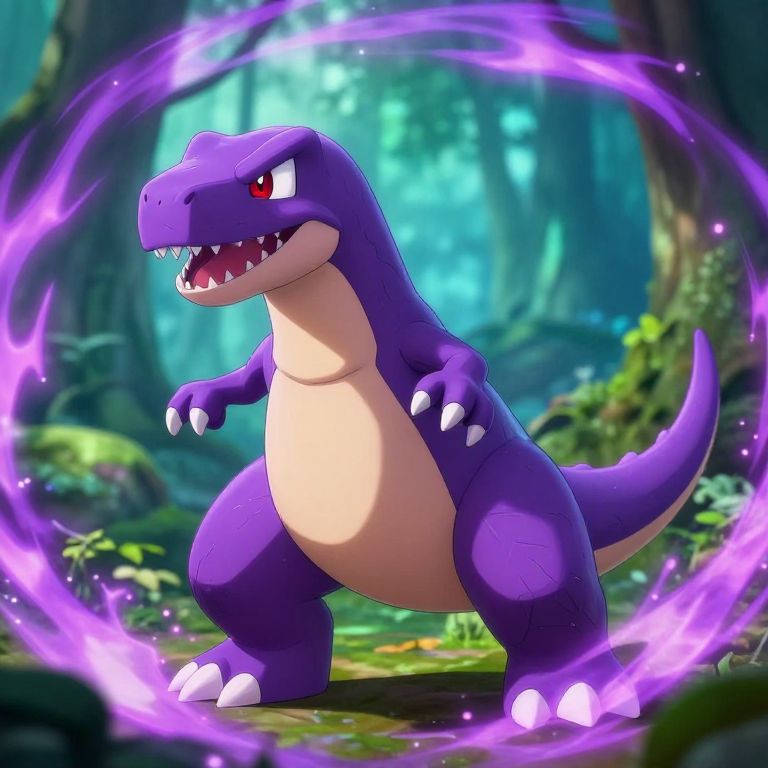 Close-up of a purple dinosaur Pokemon in a lush green forest, detailed textured skin, fierce expression, dynamic action pose with glowing purple energy swirling around