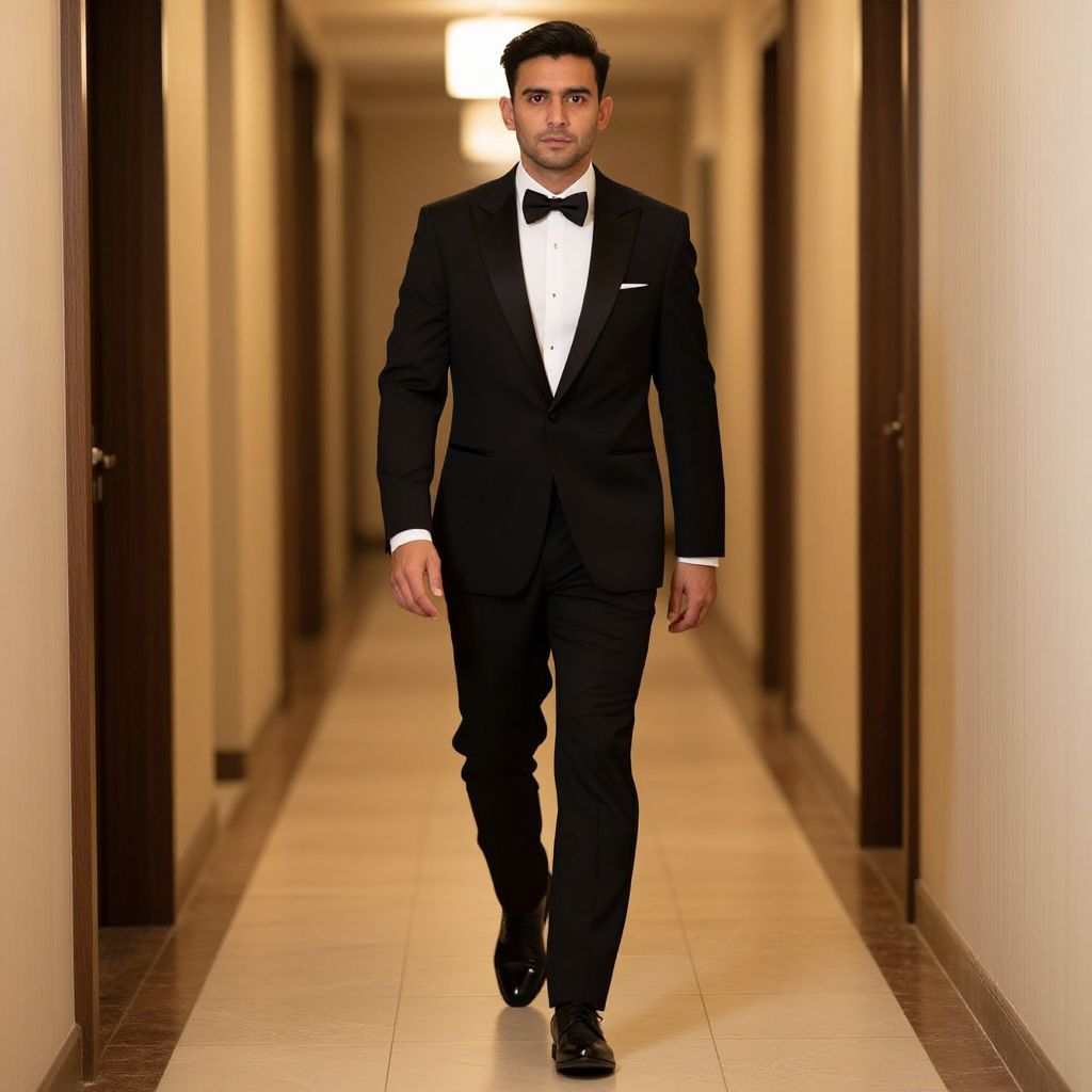 Photograph of a handsome South Asian man in a black tuxedo with bow tie, walking down an illuminated, narrow hallway.