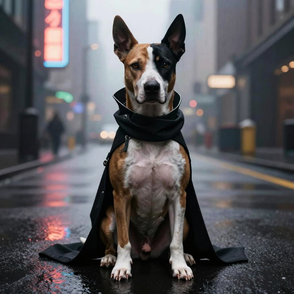 Photograph of a medium-sized, brown and white dog with a black patch over one eye, sitting on a wet, reflective city street at night. The dog wears a black, cape-like garment draped over its shoulders. The background is blurred, featuring neon lights and indistinct figures, creating a futuristic, urban atmosphere. The street surface is glossy from rain, with bright red and green reflections from the lights. The dog's expression is calm and focused, with pointed ears and a white chest. The overall color palette is dark with vibrant highlights.