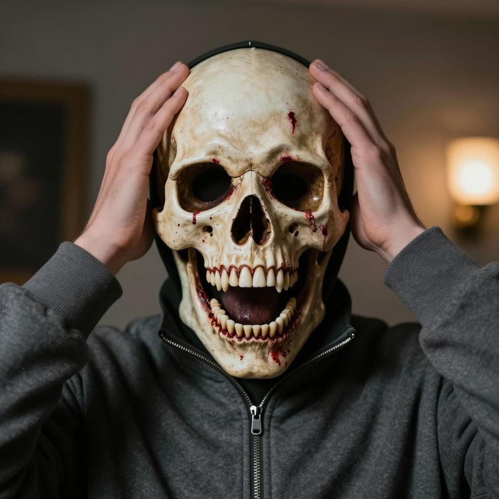 Person wearing a grotesque, bloodied, human skull mask with large, open mouth and exposed teeth. Hands gripping the top of the mask. Gray zip-up jacket. Background: dark room with blurred light source to the right. Light highlights the mask's ure. The person's face is obscured by the mask.