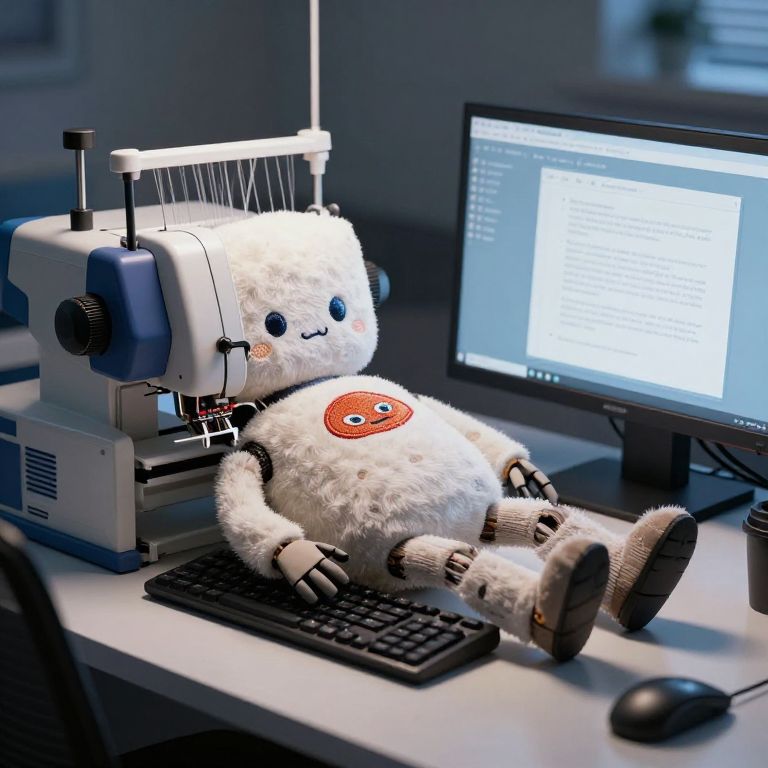 Unhappy Plush Robot on Computer Desk with Embroidery Machine