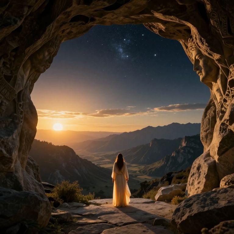 A massive, golden bell suspended beneath a stone archway glows softly against a starlit night, its presence defying gravity as it hovers above a desolate landscape, inviting the viewer into a realm where dreams and reality intertwine.