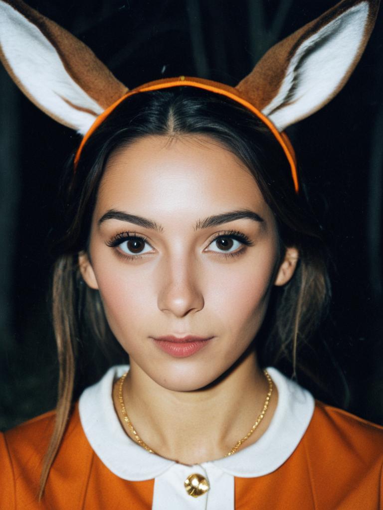 Woman in Bambi Halloween costume, photorealistic close-up headshot