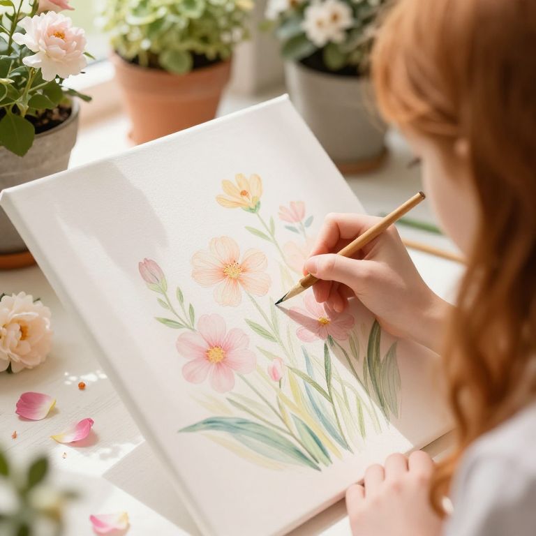 Photograph of a red-haired woman painting delicate pink flowers on a white canvas, surrounded by potted plants and flower petals.