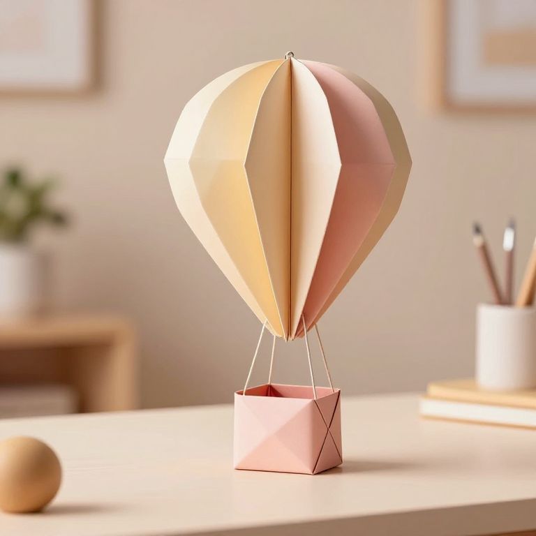 Photograph of a paper hot air balloon with cream, pink, and beige panels, on a white desk, with blurred background.