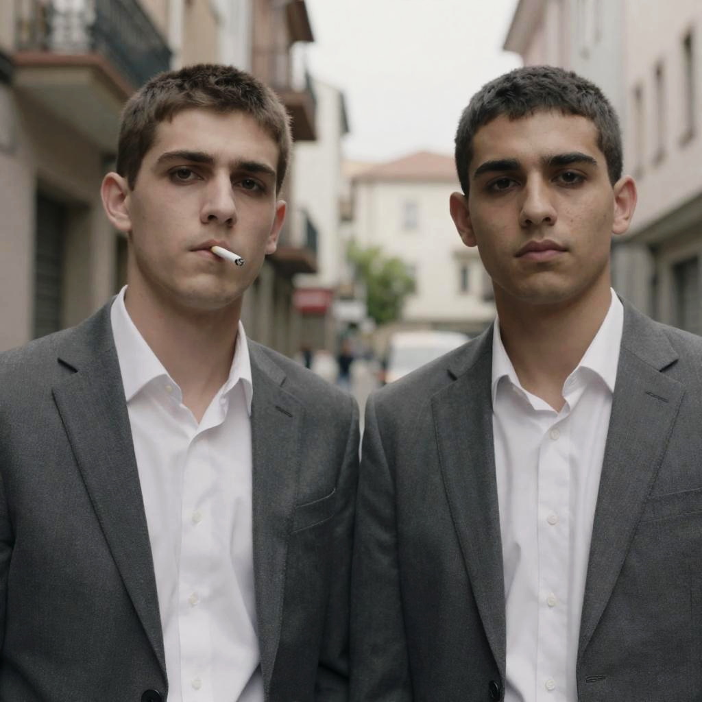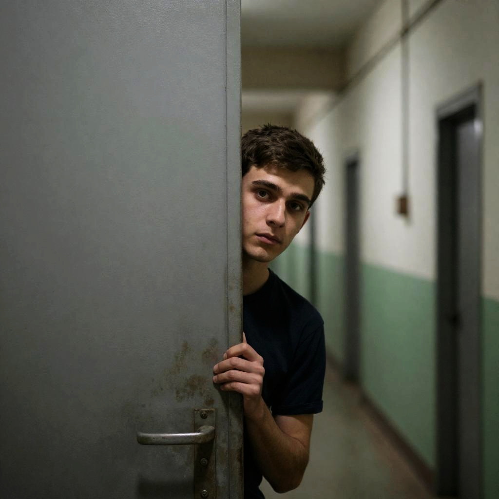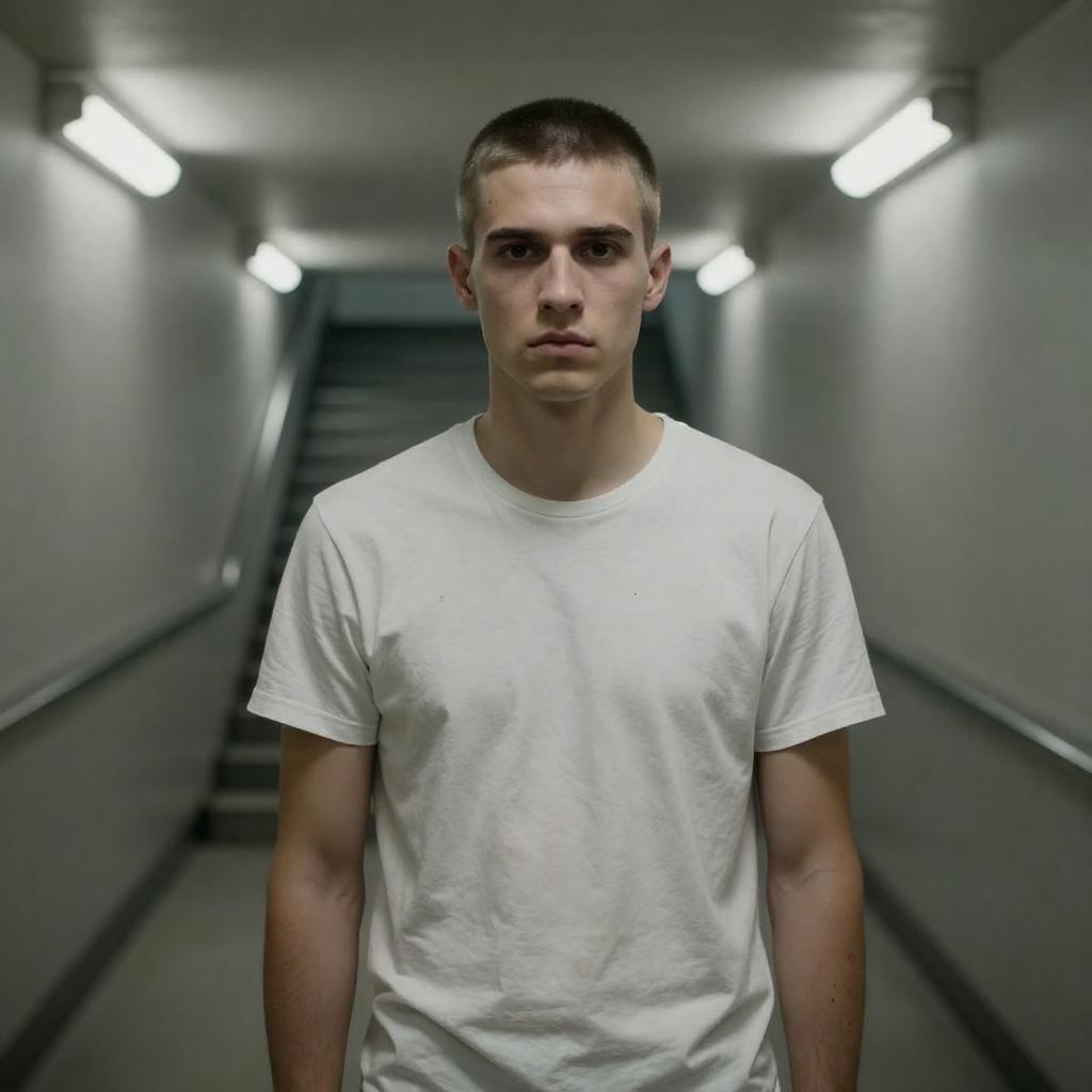 Photograph of a serious young man with short hair, wearing a slightly dirty white t-shirt, standing in a dimly lit, metallic hallway with fluorescent lights on both sides and a staircase behind him.
