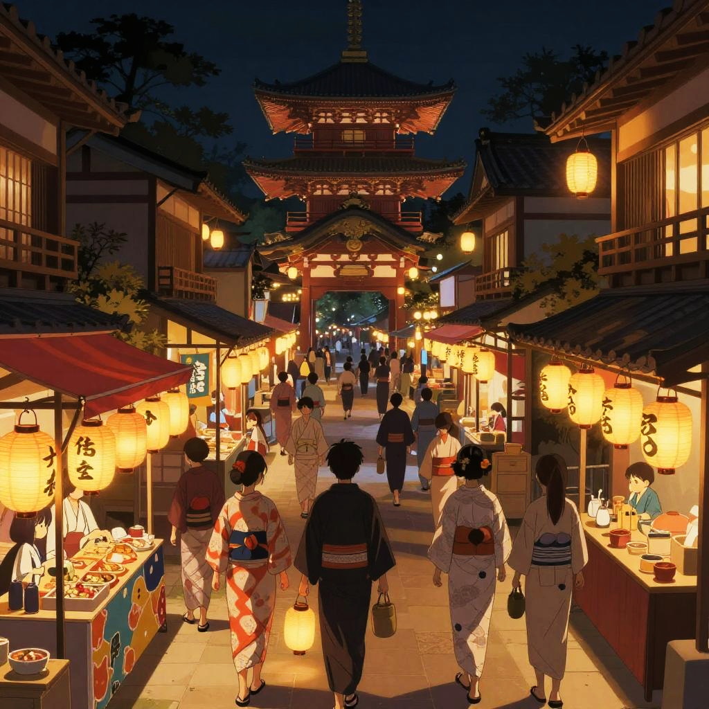 AI anime background generator generating a bustling traditional Japanese town during a festival at night, with lanterns glowing warmly, people in traditional clothing, colorful stalls, and intricate architectural details captured in vivid anime aesthetics.