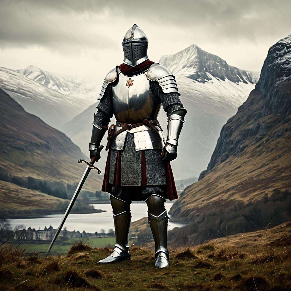 Oil-style digital painting of a medieval knight in polished steel armor standing on a grassy hill with a sword, set against the misty mountains of the Scottish Highlands. The scene features a dramatic cloudy sky and distant snow-capped peaks, with traditional armor details and a rich, muted color palette evoking timeless elegance and historical ambiance.