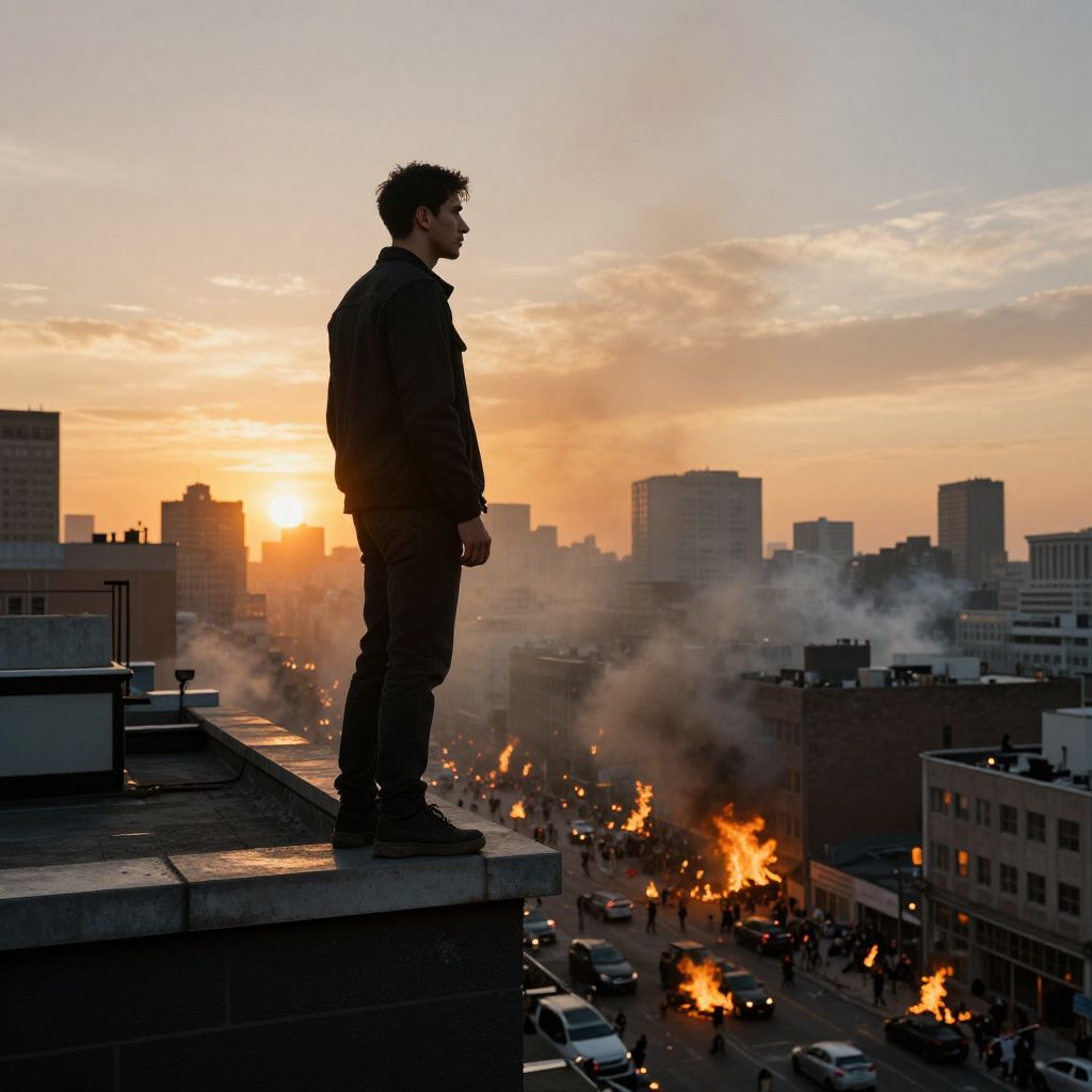 Intense urban landscape: A solitary figure stands at the edge of a rooftop, gazing out upon a tumultuous cityscape as chaos erupts below. The golden hour casts an ethereal glow on the scene, illuminating smoke-filled skies and fiery protests. His silhouette is stark against the vibrant hues of sunset, his determination palpable as he Man has masculine face and piercing eyes