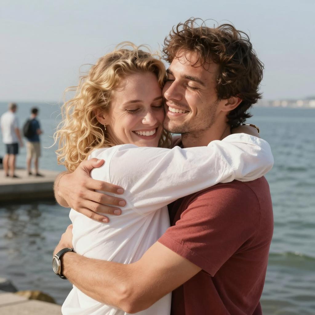 Three people in a photograph. Man in beige suit and woman in pink dress kiss passionately. Shirtless man with blue shorts and yellow cap walks past them. Large wave painting in background. Woman has blonde hair, man has dark hair. Shirtless man's muscles are defined. Woman in dress holds man's lapel. All three face left.
