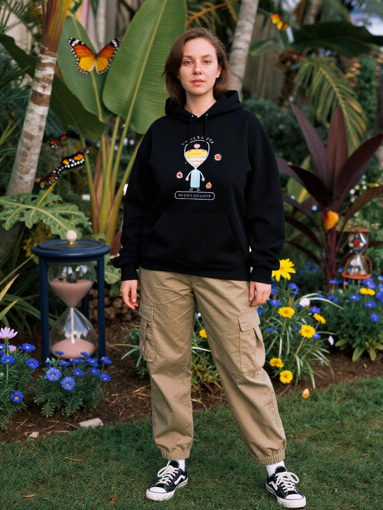 A Hourglass woman in casual streetwear, wearing a black graphic pullover hoodie and khaki cargo pants, stands in a tropical garden with a butterfly garden, captured in the vibrant style of ib technicolor film stock. She sports black and white sneakers with white socks visible, minimal jewelry, and a relaxed fit, creating a harmonious blend with the lush surroundings. Sexy. Pretty face and beаutiful eyes. Big breasts