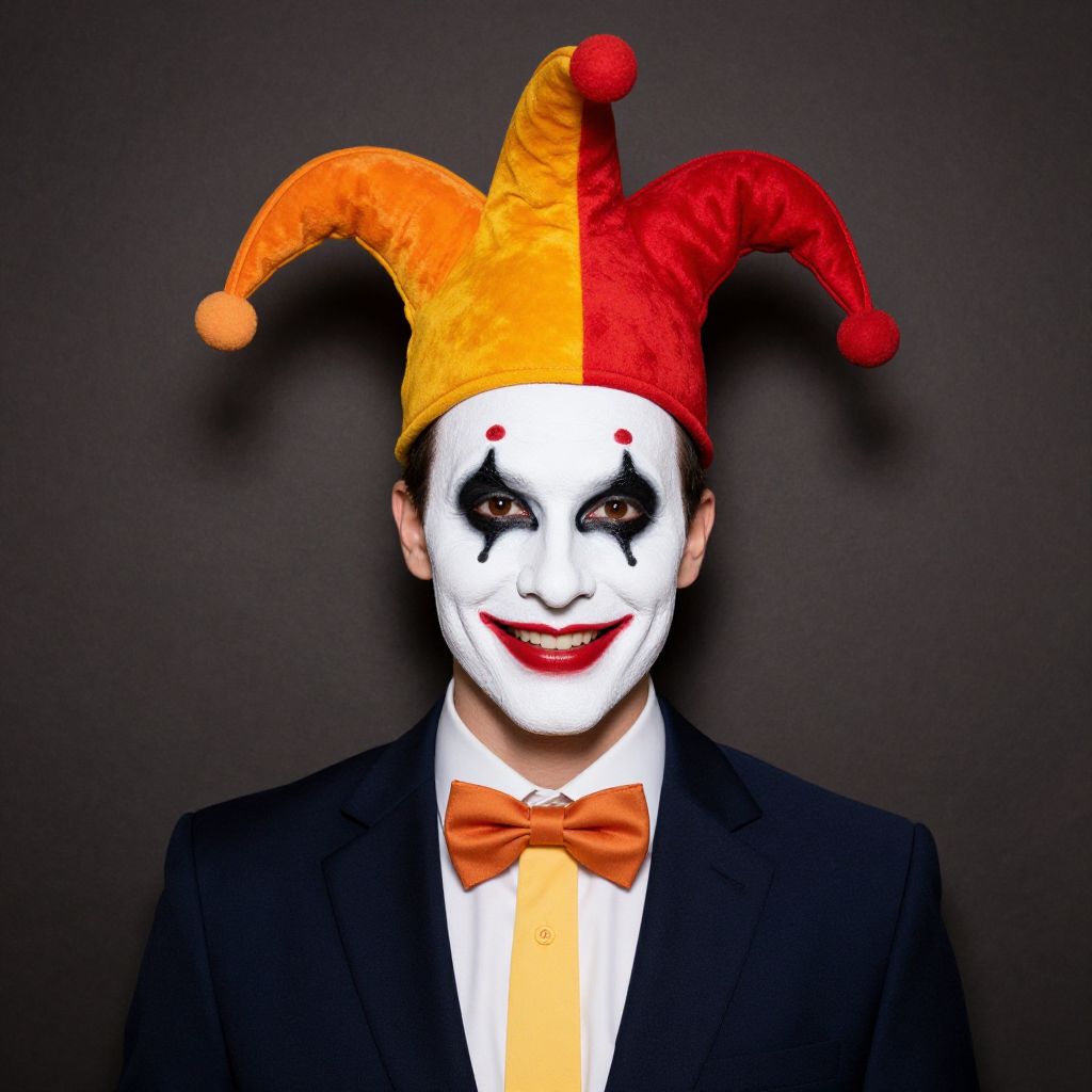 Photograph of a person in a white face mask with black eye makeup, red smile, wearing a red and yellow jester hat, black suit,