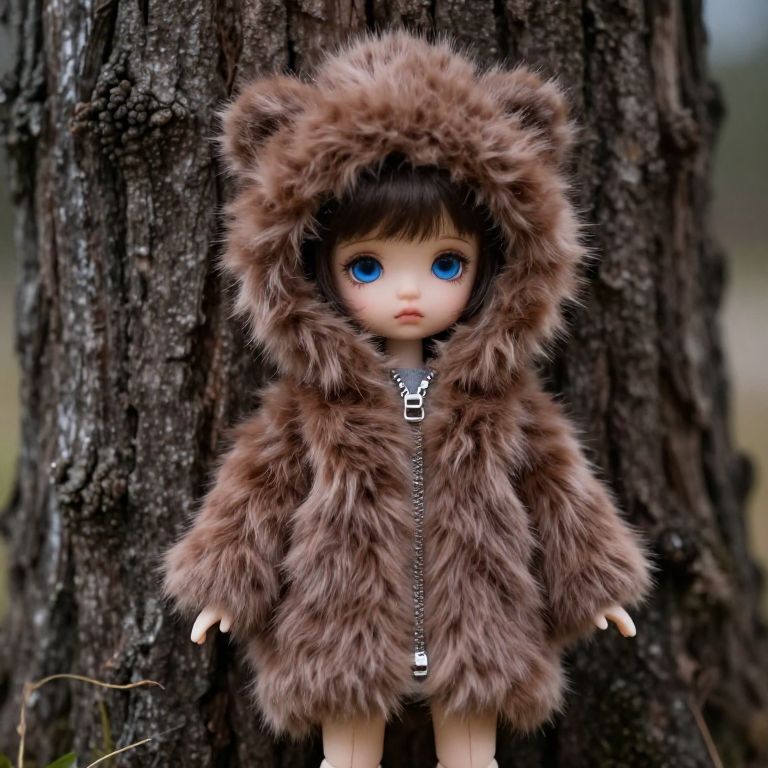 A doll with a brown fur coat and blue eyes is standing in front of a tree.
